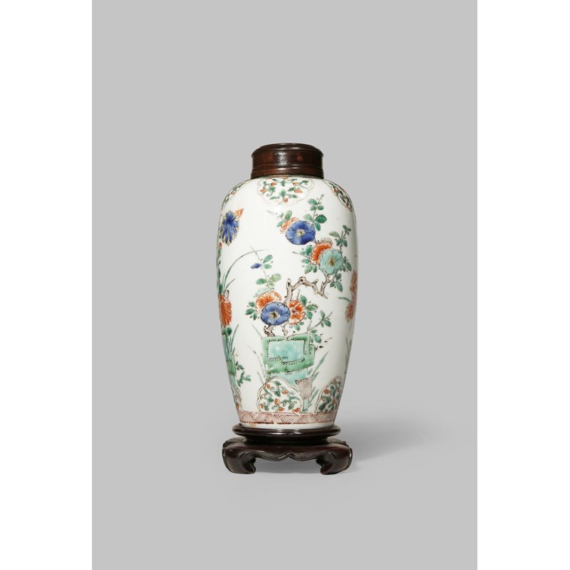 With a slender ovoid body painted with four floral sprays sprouting from rockwork, with a bands of ruyi-heads and blossoms to the shoulder and chevrons to the foot, together with a wood cover and stand, 22.5cm. (3)