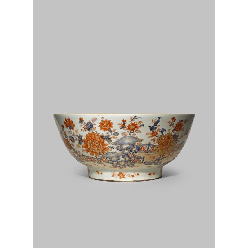 Decorated in red, blue and gilt with a fenced garden with rockwork to the exterior and flower sprays, butterflies, scrolls and chimes to the interior, 55cm.