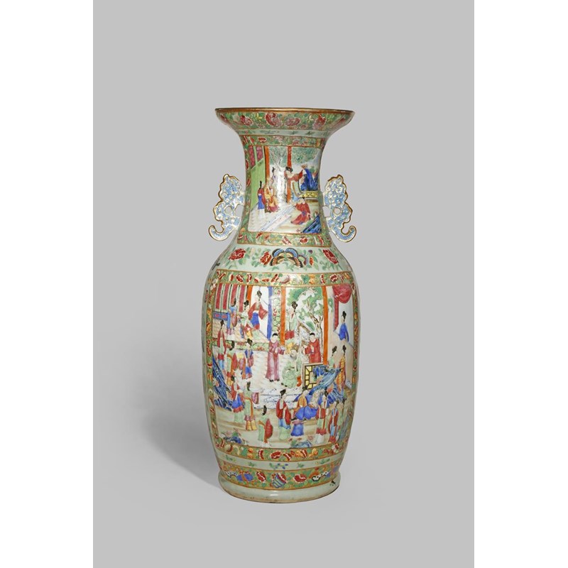 A LARGE CHINESE CANTON FAMILLE ROSE CELADON GROUND VASE