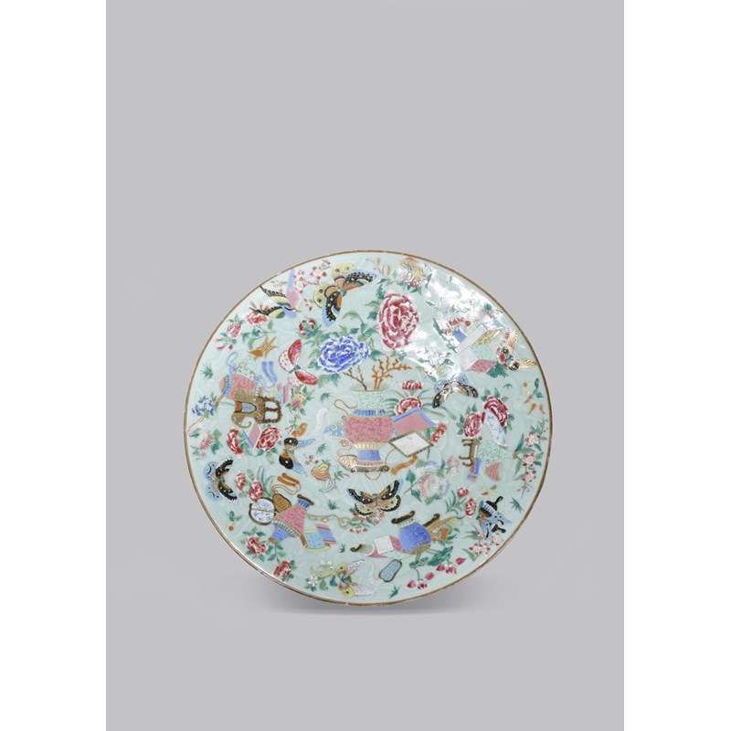 Moulded with stylised blossoms, brightly painted in enamels and gilt with blossoms, fruit, birds, butterflies and precious objects around a central vase with a coral branch and a peony spray, all on a celadon ground, 36.8cm.