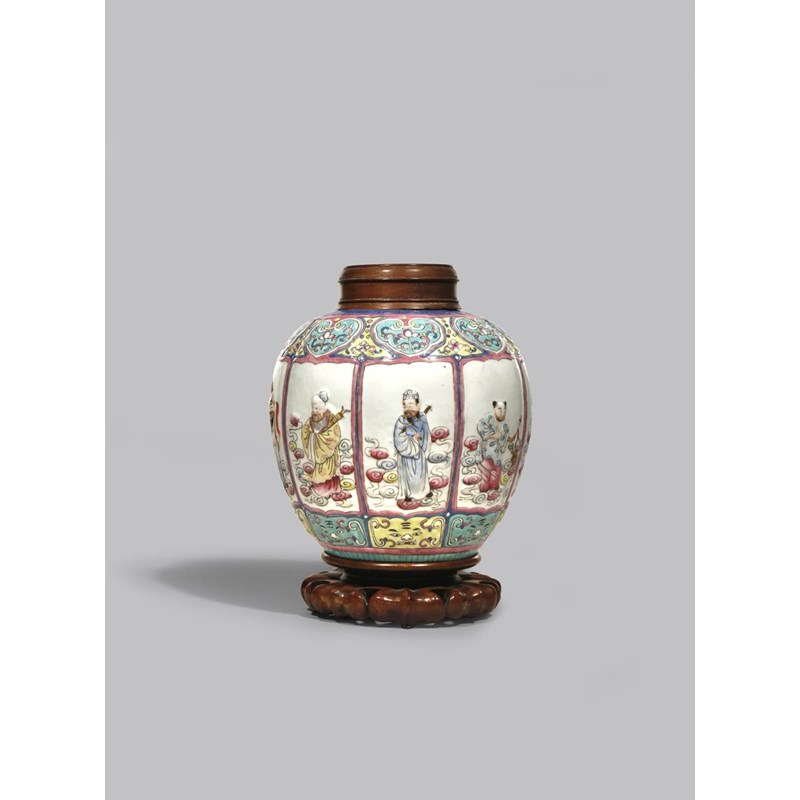 A CHINESE FAMILLE ROSE MOULDED 'EIGHT IMMORTALS' JAR