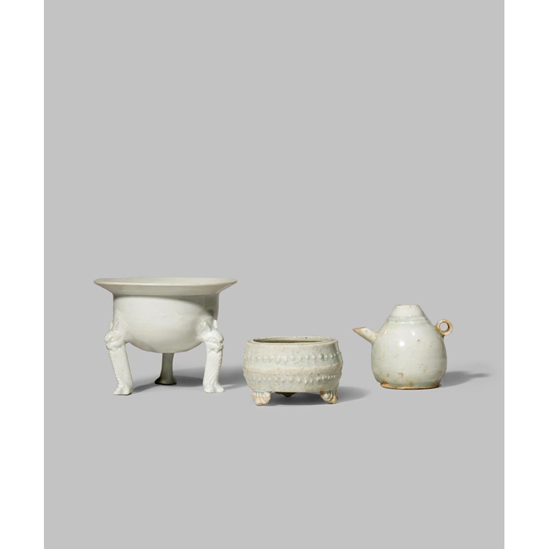 Comprising: an incense burner with a broad rim supported on three dragon mask-shaped legs, a small tripod incense burner with two bands of studs around the cylindrical body and a small water dropper, 11cm. (3)