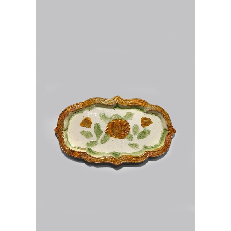 The body moulded as a cartouche, decorated to the centre with a yellow lotus flowerhead and green leaves against a cream ground, the rim with a moulded yellow foliate border, 30.6cm.