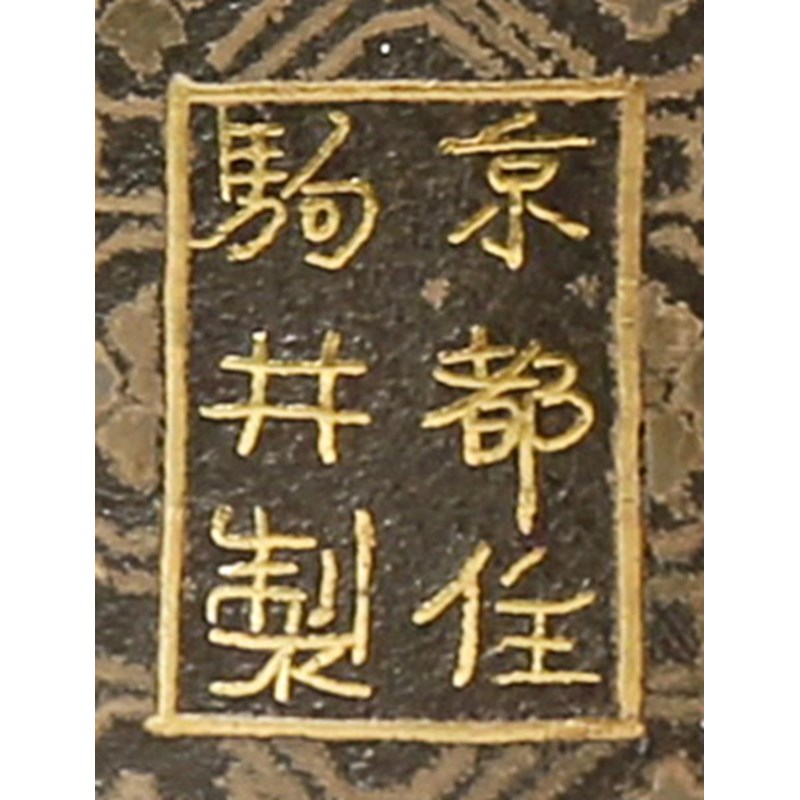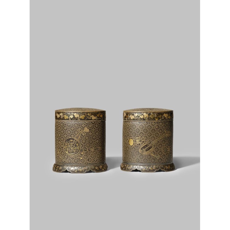 With oval cylindrical bodies decorated in nunome zogan (gold and silver inlays) with musical instruments on a dense geometrical ground, one side with a yamatogo carrying bag inscribed saikiyo o maru ma in katakana, the footrims with a band of cherry blossoms, the lids with double gourds and vines and topped with depictions of notebooks, one signed Kyoto ju Komai sei 7.8cm. (4)