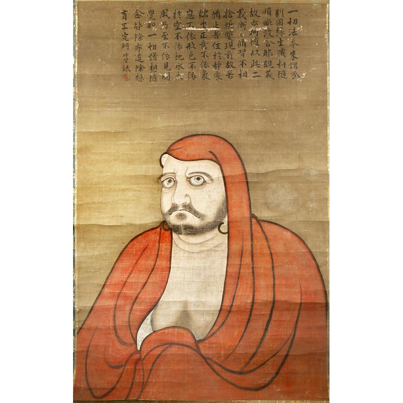 Depicting Daruma wearing a red hooded robe and hoop earrings, with Zen scriptures from a sutra above him and two seals, the design probably inspired by the portrait of Daruma by Soga Jasoku (d.1483) at the Kyoto Imperial Museum, 86.5cm x 136.5cm.