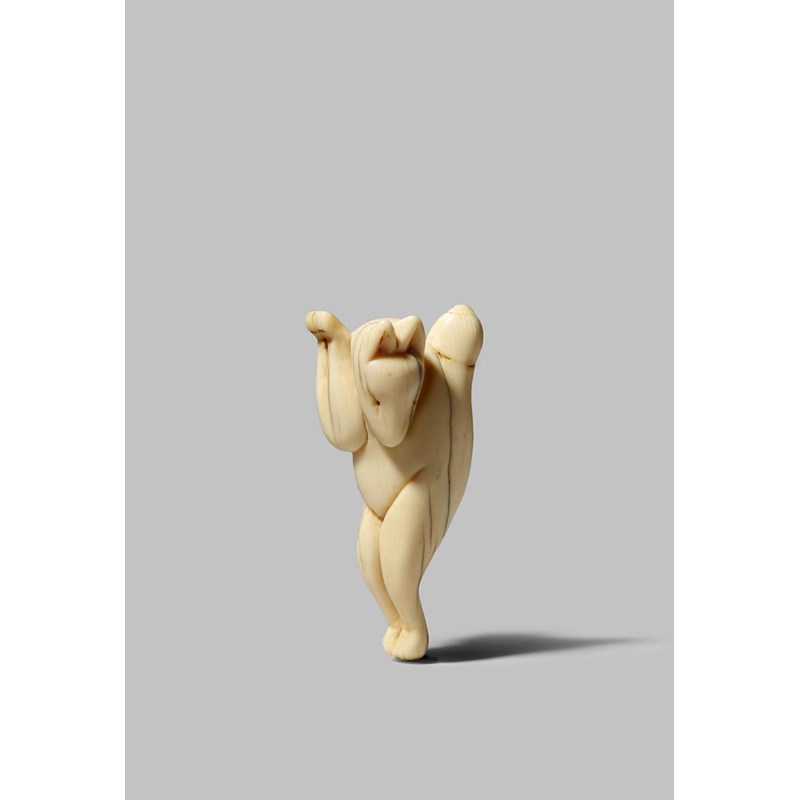 A JAPANESE IVORY NETSUKE EDO 1615-1868 Carved as a stylised dancing fox
