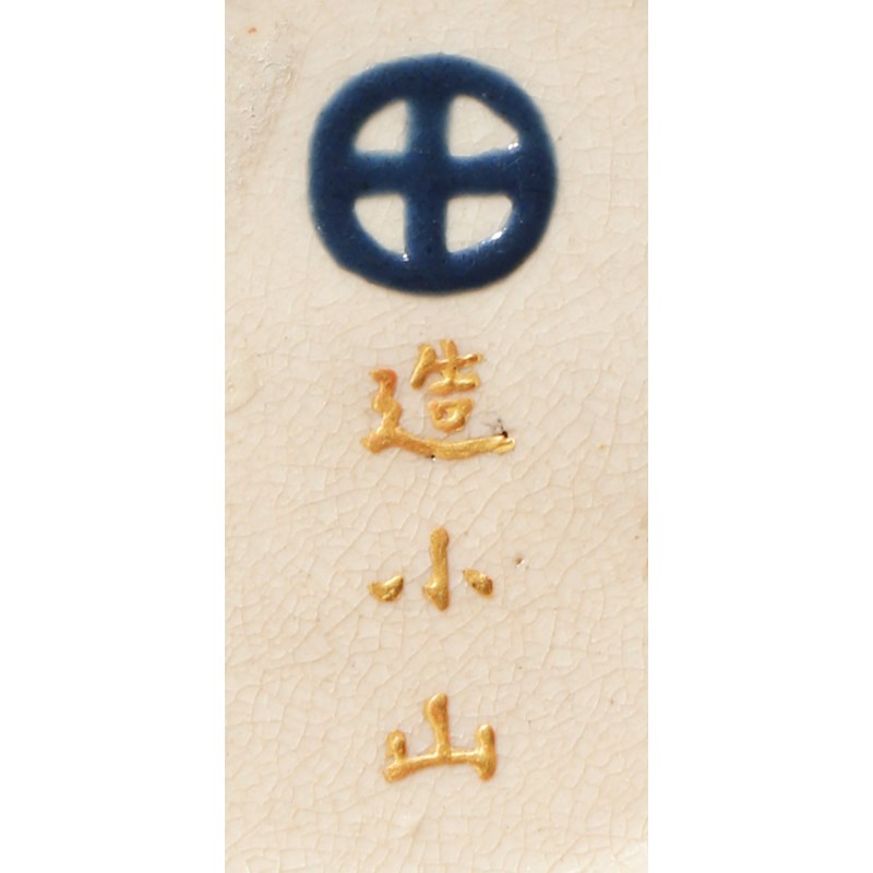 The compressed bulbous body raised on three short feet, decorated with a continuous scene of Mandarin ducks on a stream, with the Three Friends of Winter (prunus, pine and bamboo) above them, the lid with a chrysanthemum-shaped knop and with brocade designs, the base with the Shimazu mon and inscribed underneath tsukuru Oyama/Koyama, 10.3cm overall. (2)