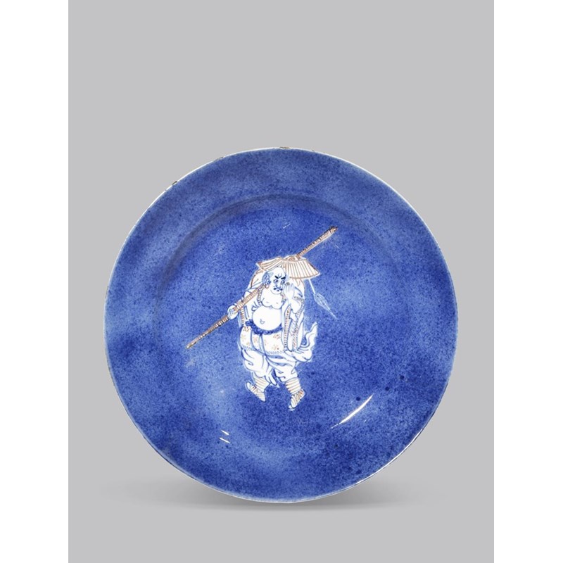 Decorated with a figure of a travelling warrior monk carrying a large bundle, a fly whisk and a long stick on his back, all reserved against a powder blue ground, with sprays of bamboo and a flower mark in a double circle to the reverse, 26cm.
