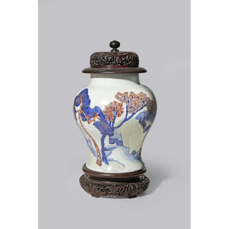 Carved and painted with trees and flying birds and a small figure in a sampan in a rocky landscape, together with a hardwood cover and stand, 24.5cm. (3)