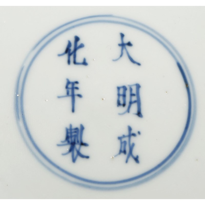 Painted with a lotus pond with five swimming ducks and a sixth in flight, the reverse with a six character Chenghua mark, 20cm.