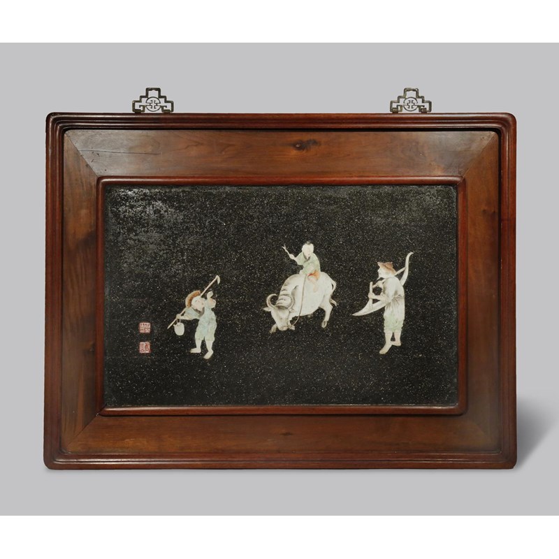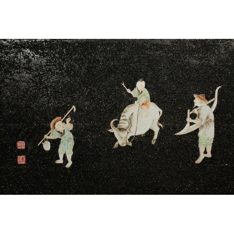 Set with three porcelain plaques depicting a boy and a buffalo, a farmer and an attendant and with two square seals, one inscribed Tang Ying zhi yin, the other Jun Gong, set on a black granular ground within a later hardwood frame, the reverse with black lacquer, 70cm x 81cm overall.