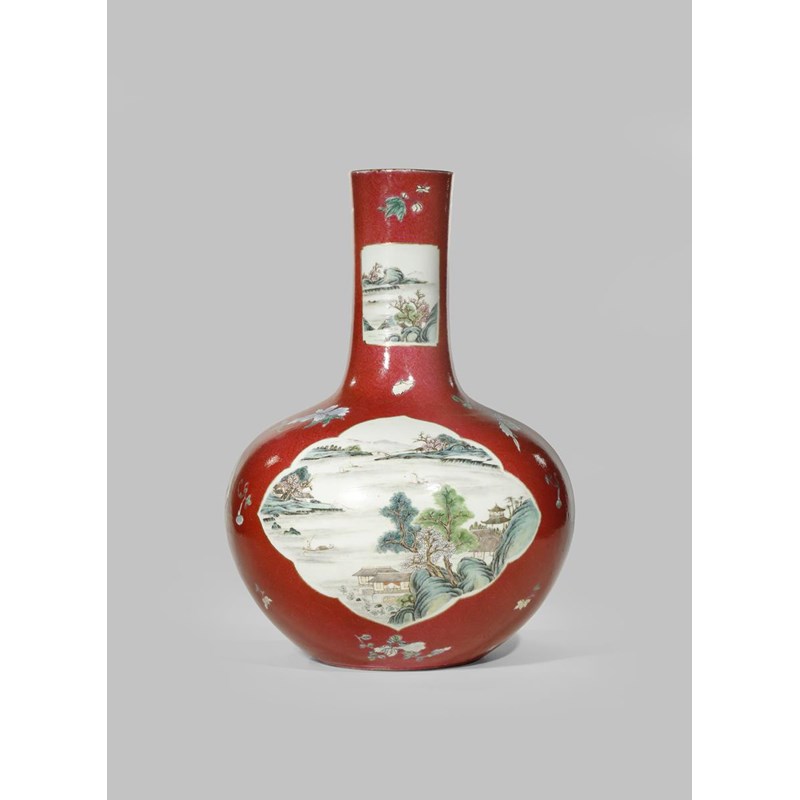 With an ovoid body and a gently flaring cylindrical neck, decorated with shaped cartouches containing finely painted landscapes and with loose blossoms, a six character Qianlong mark to the base, 53.5cm.