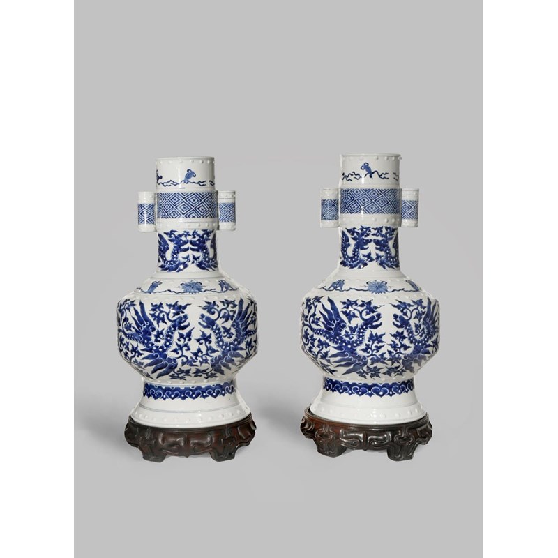 A PAIR OF CHINESE BLUE AND WHITE PHOENIX ARROW VASES