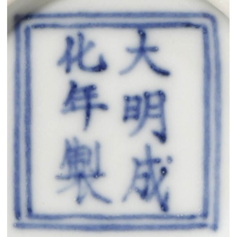 With a gently curving body decorated to each side with a cockerel and a hen looking after their chicks between ornamental rockery and floral sprays, a six character Chenghua mark within a double square to the base, 9.1cm.