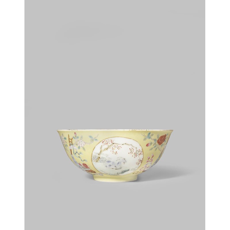 The exterior brightly enamelled with three roundels containing goats, between vases with blossoms, fruit and precious objects against a yellow ground, the interior painted in underglaze blue with three goats in a landscape encircled by blossoming branches and auspicious objects, 15cm.