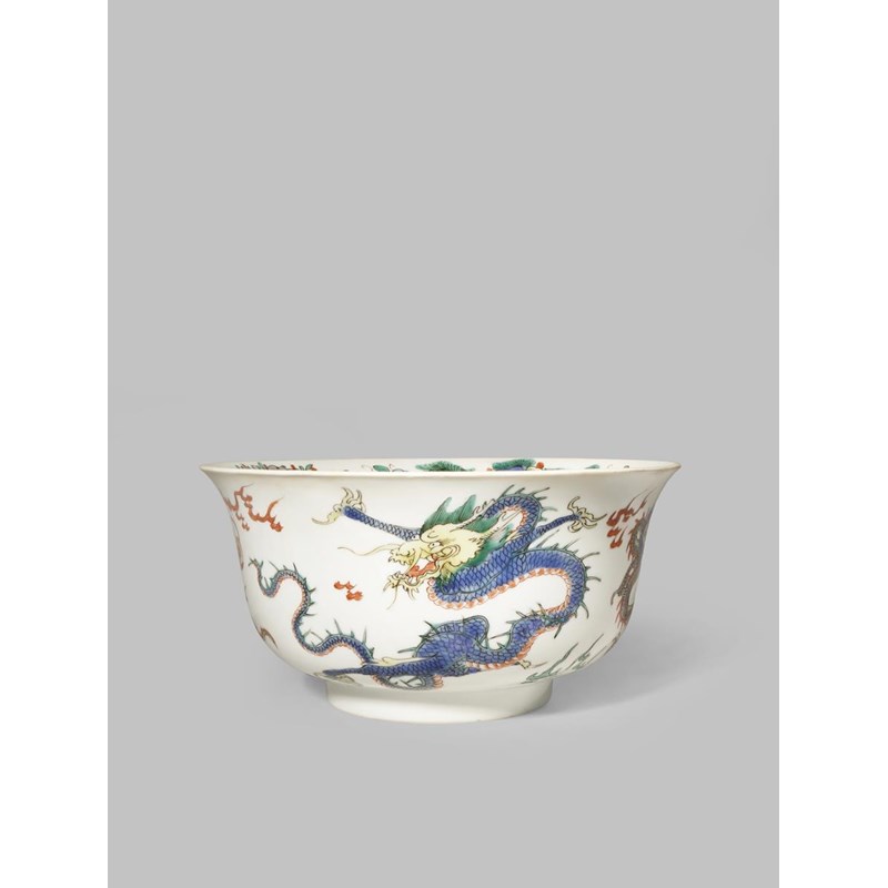 A CHINESE FAMILLE VERTE 'FIVE-DRAGON' BOWL KANGXI 1662-1722 The exterior painted with four...