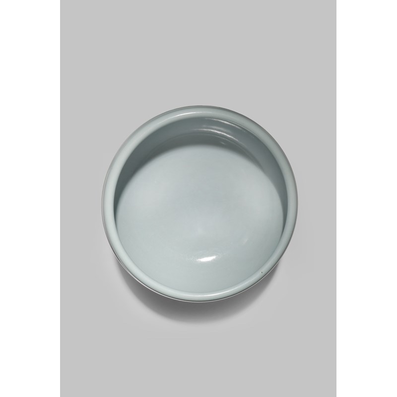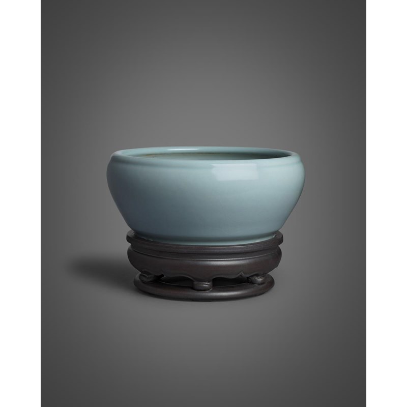 A LARGE CHINESE IMPERIAL RU-TYPE BRUSH WASHER WITH AN INTEGRAL PORCELAIN STAND