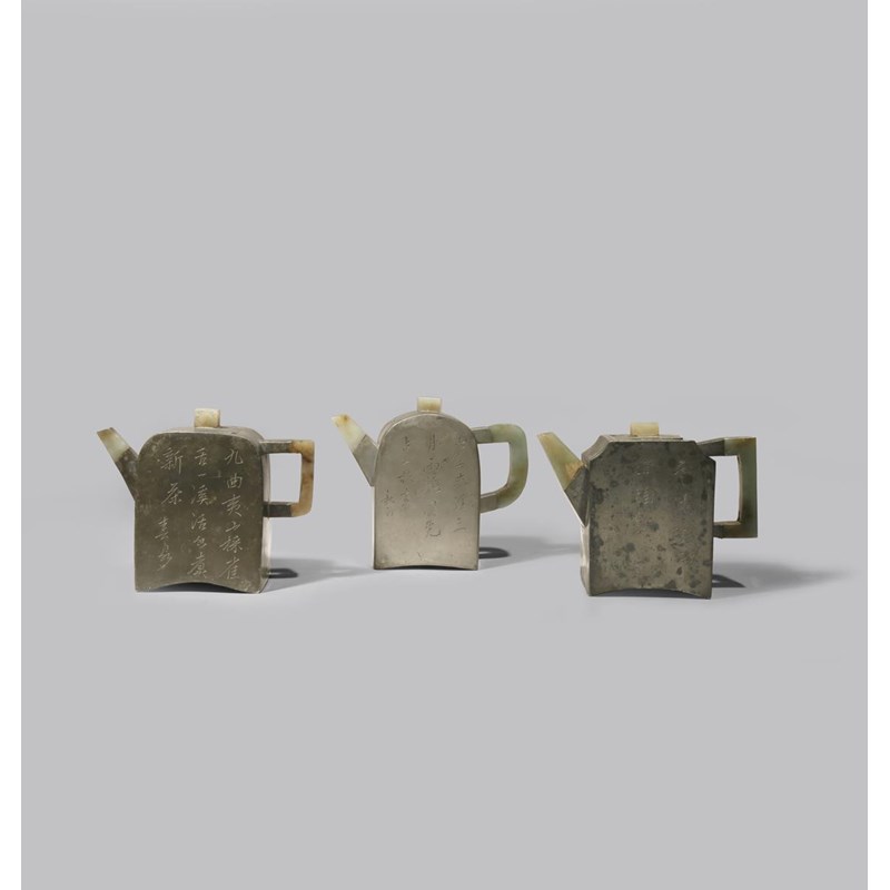 ONE CHINESE PEWTER AND TWO PEWTER-ENCASED YIXING TEAPOTS AND COVERS QING DYNASTY All set with...