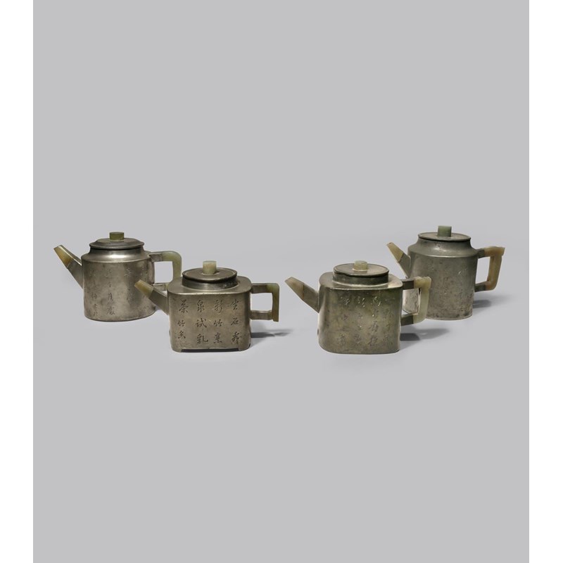 Two of cylindrical form, two square-section, each set with jade handles, knops and spouts, inscribed with poems and incised with blossoms, two with seals to the interiors, 16.5cm. (8)