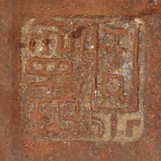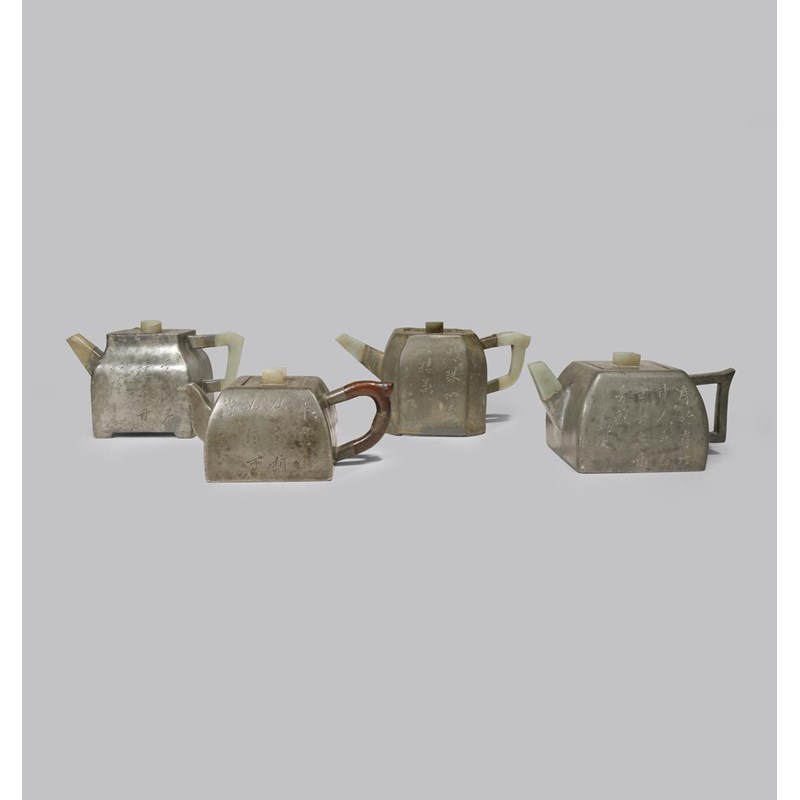 FOUR CHINESE INSCRIBED PEWTER-ENCASED YIXING SQUARE-SECTION TEAPOTS AND COVERS QING DYNASTY Three...