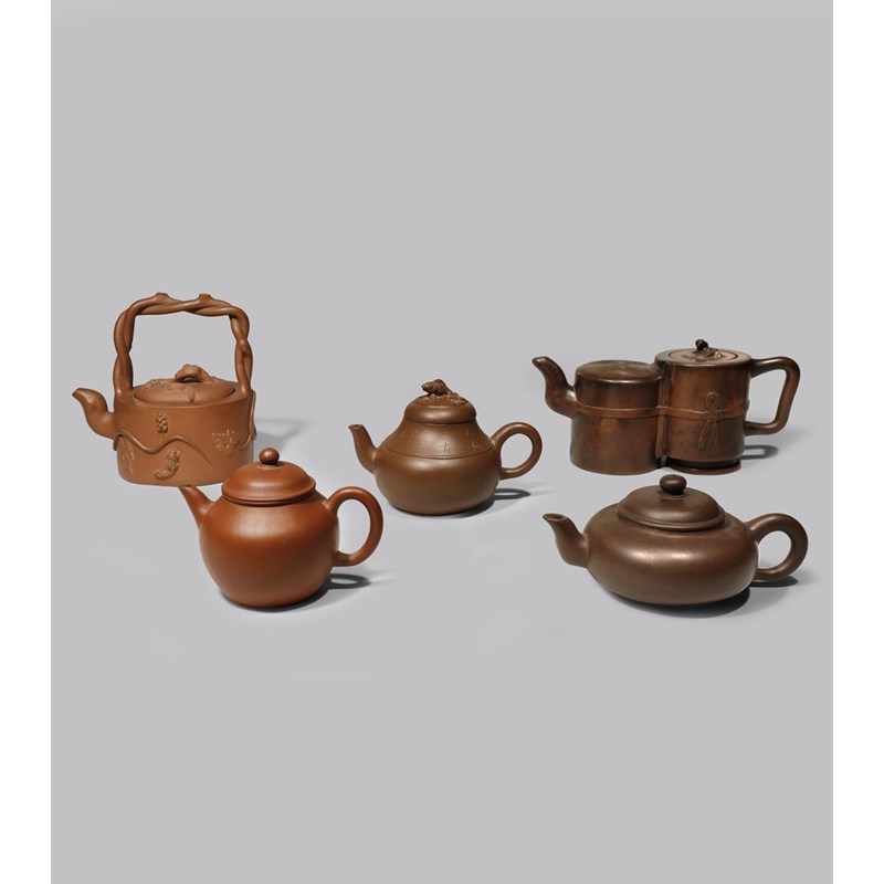 FIVE CHINESE YIXING TEAPOTS AND COVERS QING DYNASTY One shaped as two conjoined cylinders with a...