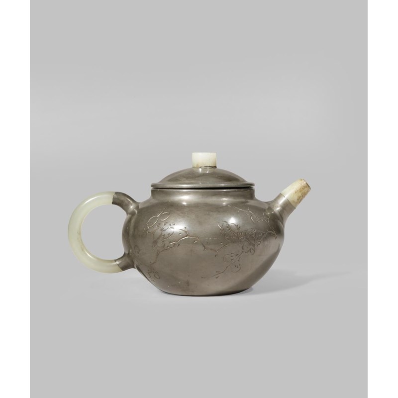 The handle, spout and cover set with jade, the body incised with prunus and a poem about tea drinking, the interior with a seal mark, 15.5cm. (2)
