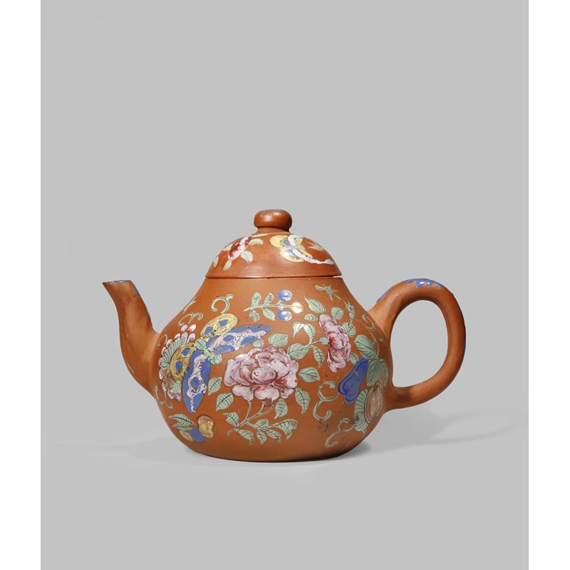 A CHINESE YIXING TEAPOT AND COVER LATE QING DYNASTY The pear-shaped body decorated with colourful...