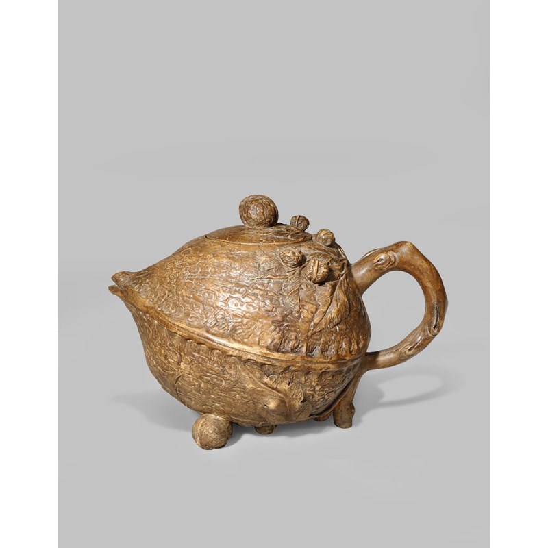 A CHINESE YIXING TEAPOT AND COVER MOULDED AS A WALNUT QING DYNASTY The body applied with smaller...