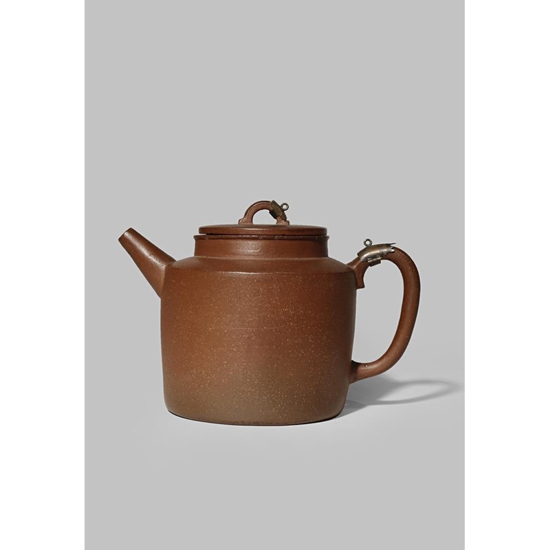 A CHINESE YIXING CYLINDRICAL TEAPOT 17TH/18TH CENTURY With a short spout and metal mounts to the...