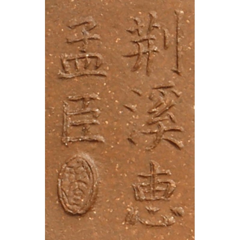 With a short spout and metal mounts to the handle and the associated cover, a five character mark to the base which reads Jing Xi Hui Meng Chen and an oval seal, 17.5cm. (2)