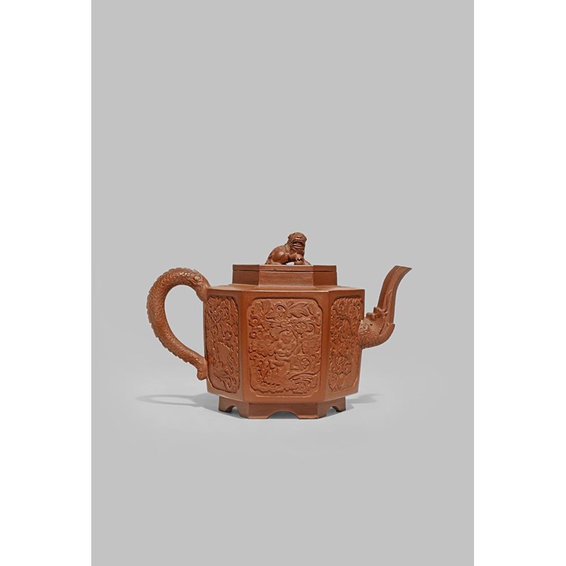 A CHINESE YIXING HEXAGONAL TEAPOT AND COVER 18TH CENTURY The body with two panels moulded with a...