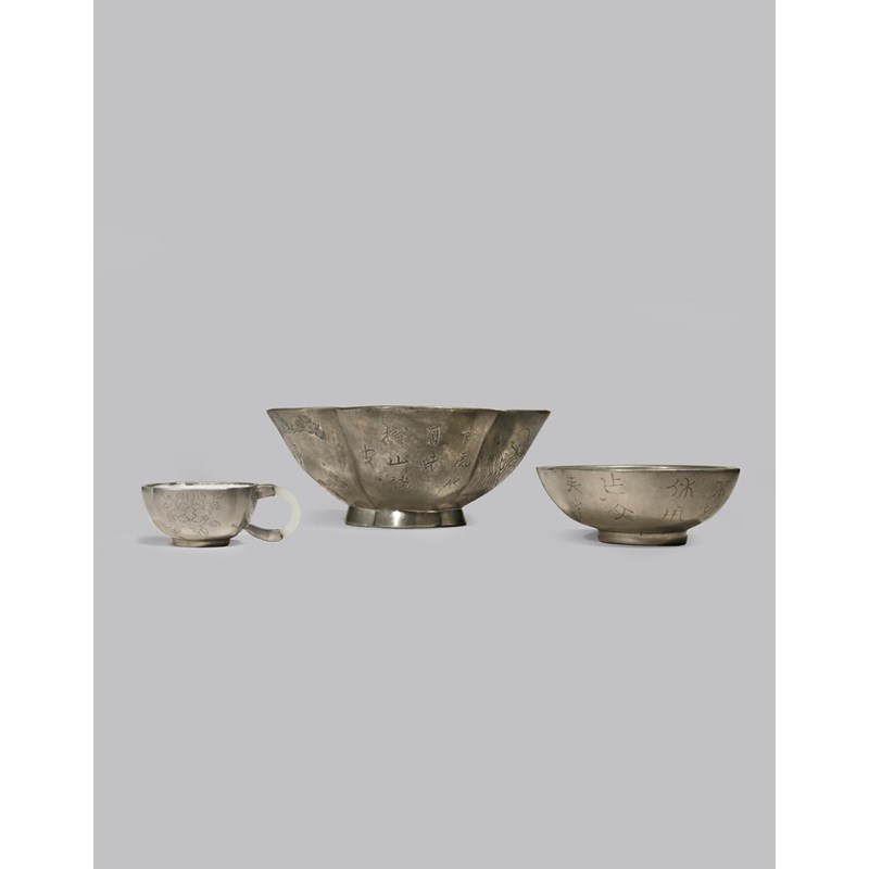 Each with a Yixing body coated with white enamel, the large lobed bowl incised with landscape and calligraphy to the exterior, the peach-shaped bowl with a poem and a pine tree, the cup set with a C-shaped hardstone handle and decorated with seal script and blossoms, 21.5cm. (3)