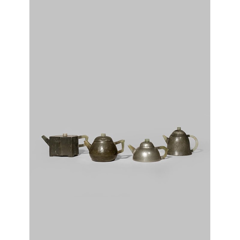 FOUR CHINESE INSCRIBED PEWTER-ENCASED YIXING TEAPOTS AND COVERS