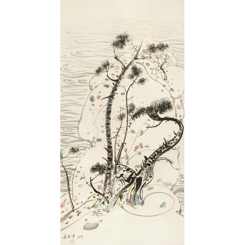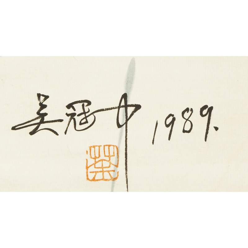 A Chinese scroll painting, ink and colour on paper, a signature which reads Wu Guan Zhong and the date 1989, with an artist's seal, which reads Tu, mounted, 127cm x 66cm.