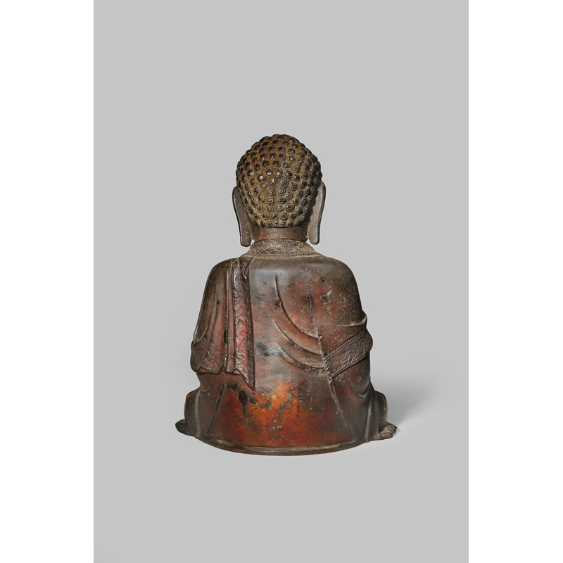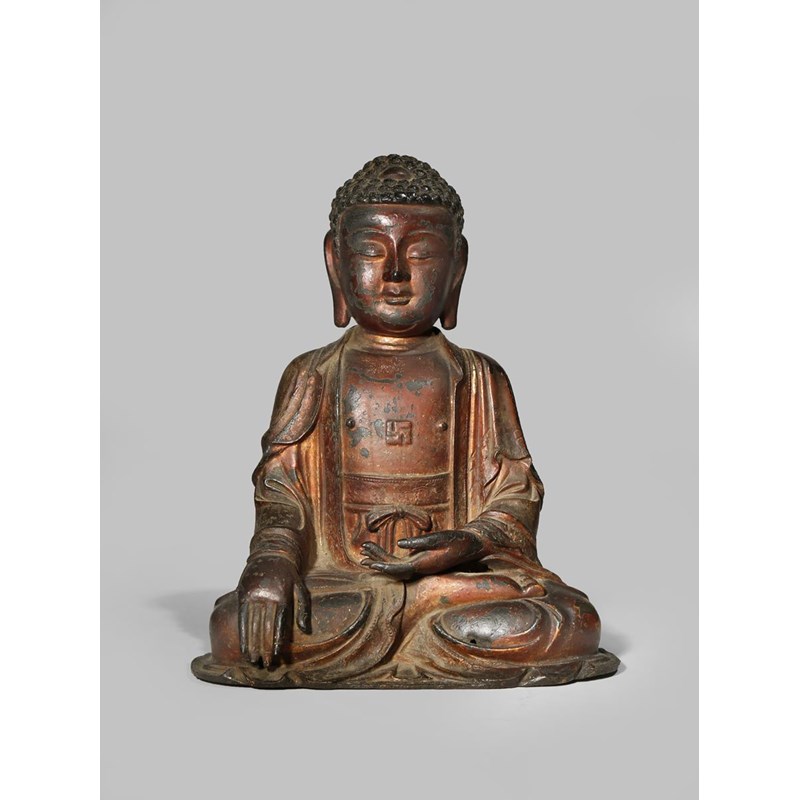 A CHINESE GILT AND LACQUERED BRONZE FIGURE OF BUDDHA SAKYAMUNI