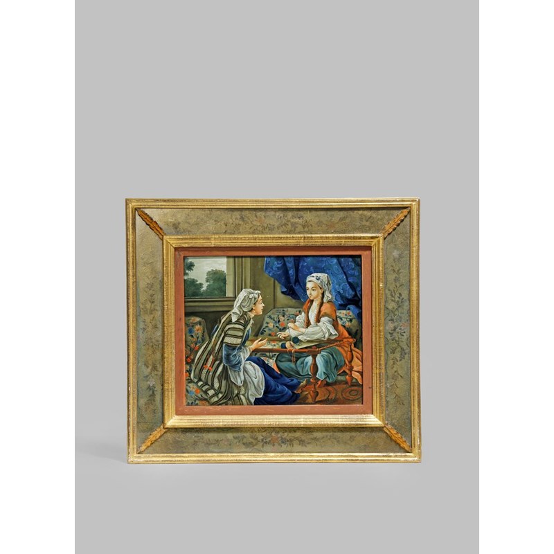 Depicting Madame de Pompadour in an interior, wearing an Oriental costume, seated while working on an embroidery panel chatting to her attendant. The scene is after the 'Sultan's Wife Embroidering', a painting from 1747 by Charles-André van Loo (1705-1765), framed and glazed, 46.5cm x 51.5cm.