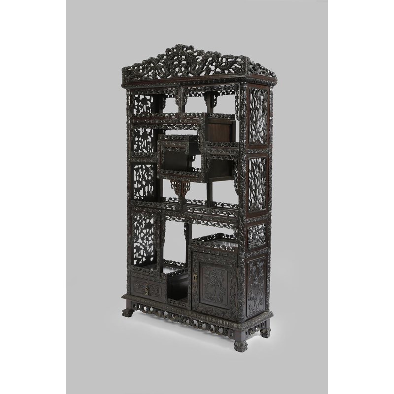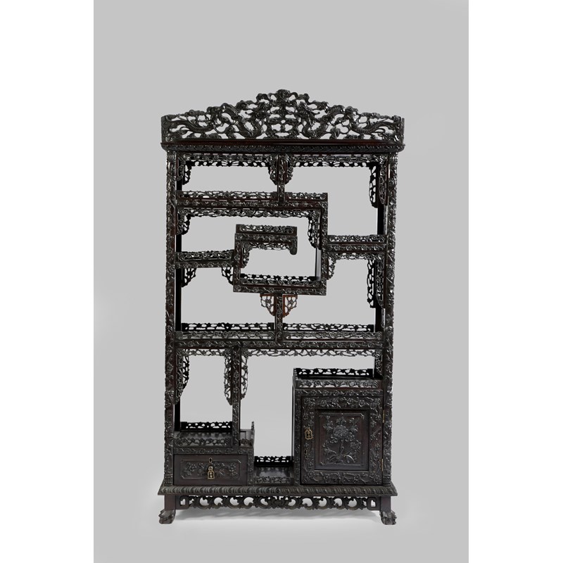 Carved with bamboo, prunus, chrysanthemum and peony and with an arrangement of shelves, a cupboard and a single drawer, the cresting rail decorated with dragons, 186cm x 98cm x 35cm.