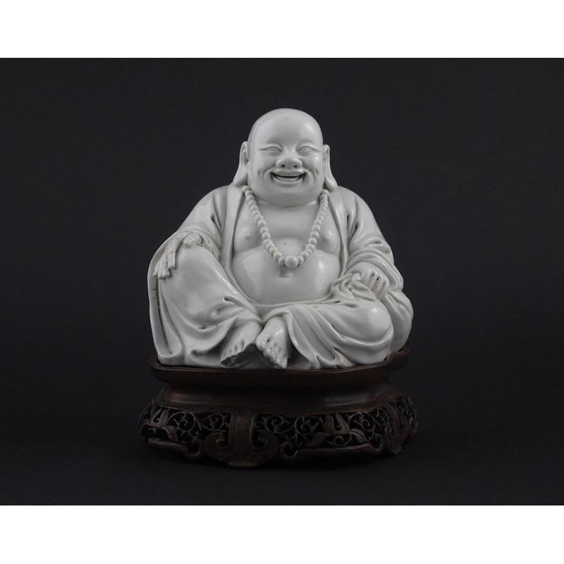 A Chinese blanc de Chine figure of Buddhai Ho Shang 18th century, the corpulent monk seated, wearing a rosary and raised on a wood stand, damage to his hand and one foot, 17cm. (2)