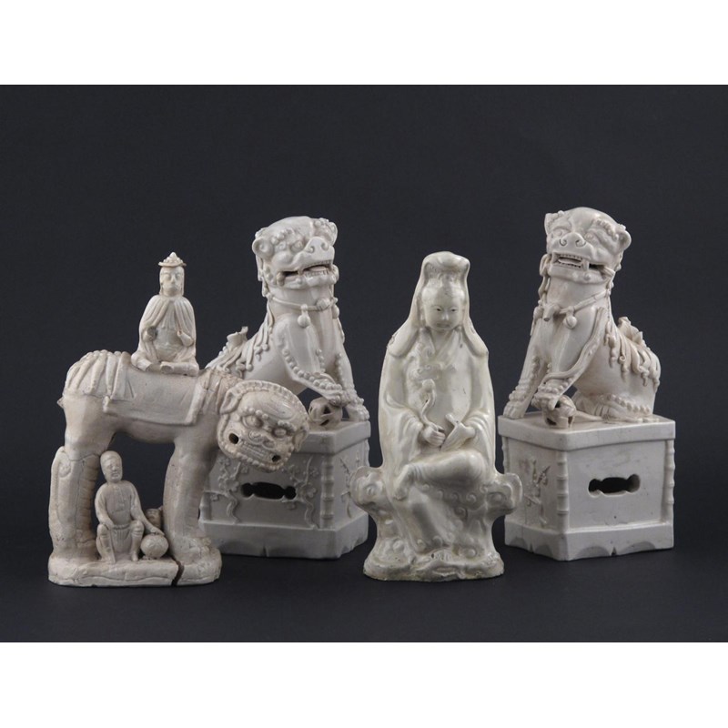 A near pair of Chinese blanc de Chine Buddhist lion dogs 17th century, another single lion dog standing accompanied by two figures and two puppies, and a cream-glazed pottery figure of Guanyin, damages, 30cm. (4)