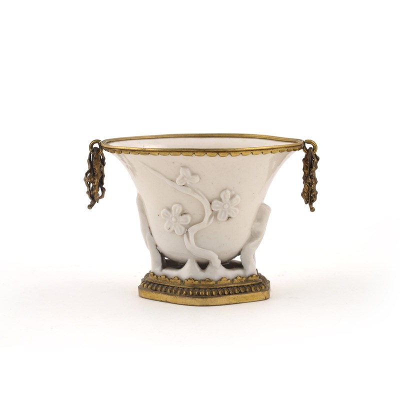 A Chinese blanc de Chine libation cup 18th century, applied with prunus sprigs and with European ormolu mounts to the rim and foot, an inscription to the base which reads 'Escalier de Cristal, Paris', a chip beneath the rim, 10cm.