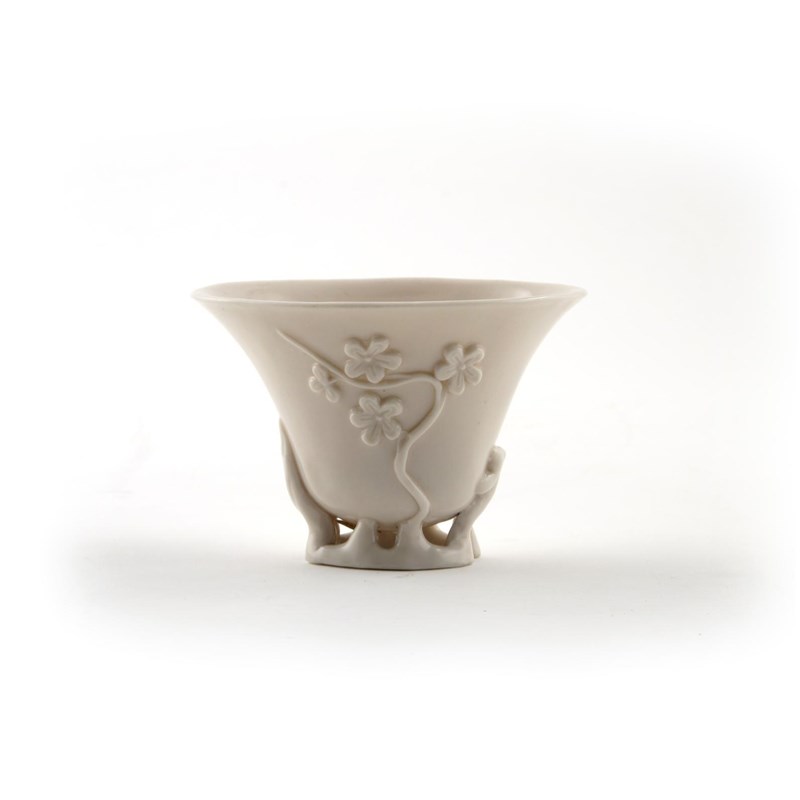 A good blanc de Chine libation cup 18th century, the flared form raised on a low base formed as twigs with prunus sprays to each side, paper label for S. Weinberg Sammlung, 12.4cm across.