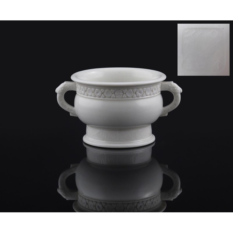 An unusual Chinese blanc de Chine incense burner c.1700, after an archaic bronze, moulded with a band of stylized flowers with animal mask handles and tall key-fret moulded foot, the base faintly moulded with a square mark, the handle pendant terminals ground, 18.5cm.