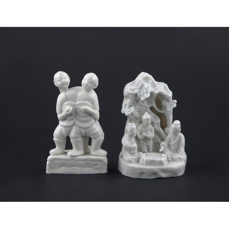 Two small Chinese blanc de Chine figure groups c.1700, one of the laughing twins, the other of two figures and an attendant playing chess beneath a rocky outcrop, minor faults, 10,2cm. (2)