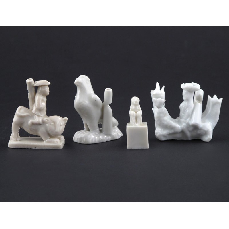 Three Chinese blanc de Chine whistles c.1700, two modelled with Europeans, one riding a tiger, the other a dragon, the third with a bird, together with a small uncut seal with a monkey finial, minor damages, 5.5cm. (4)