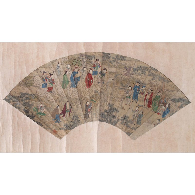 A Chinese paper fan panel, depicting figures on a terrace and amidst clouds, mounted on a small scroll, damages, 47cm across.