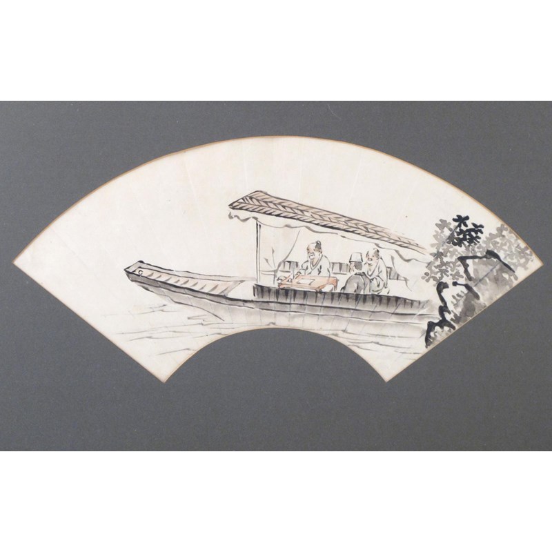A Chinese fan panel, painted with three figures in a small boat, framed and glazed, 47.5cm.