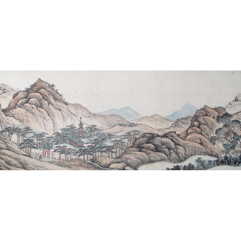 A Chinese hand scroll, depicting an extensive landscape scene with small boats on water and mountains beyond, with a long panel of calligraphy, the landscape 271cm, the calligraphy 395cm.