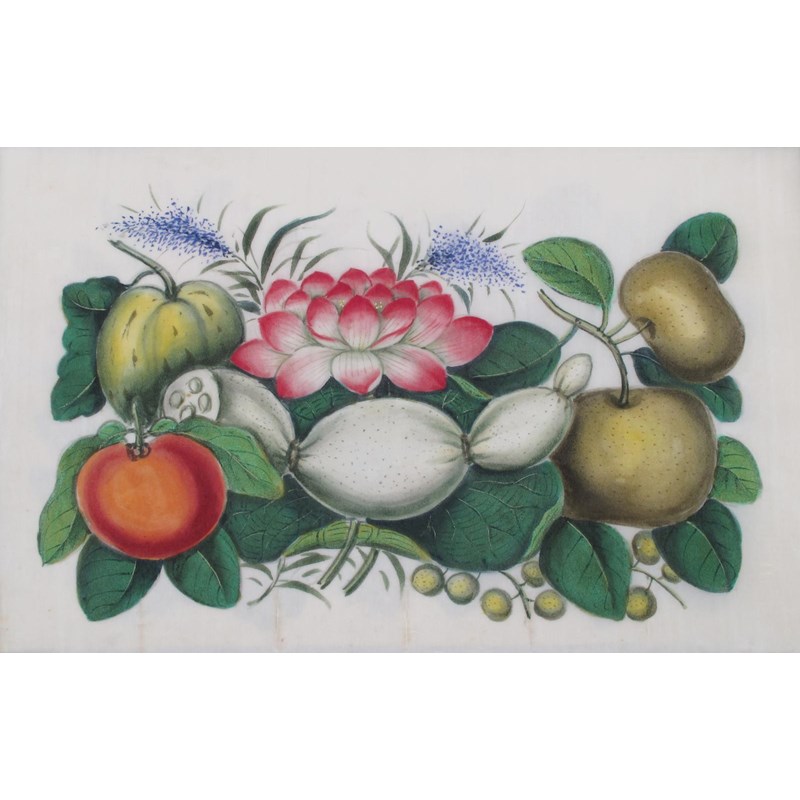 An album of twelve Chinese pith paper paintings 19th century, illustrating birds, figures in various pursuits, fruit and flowers, some damages, 21cm x 33cm.