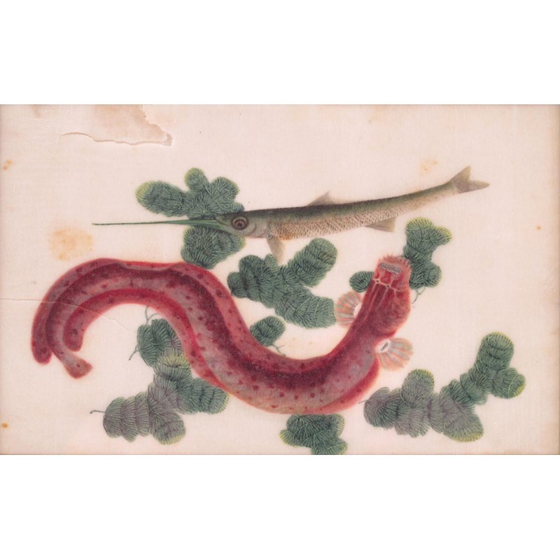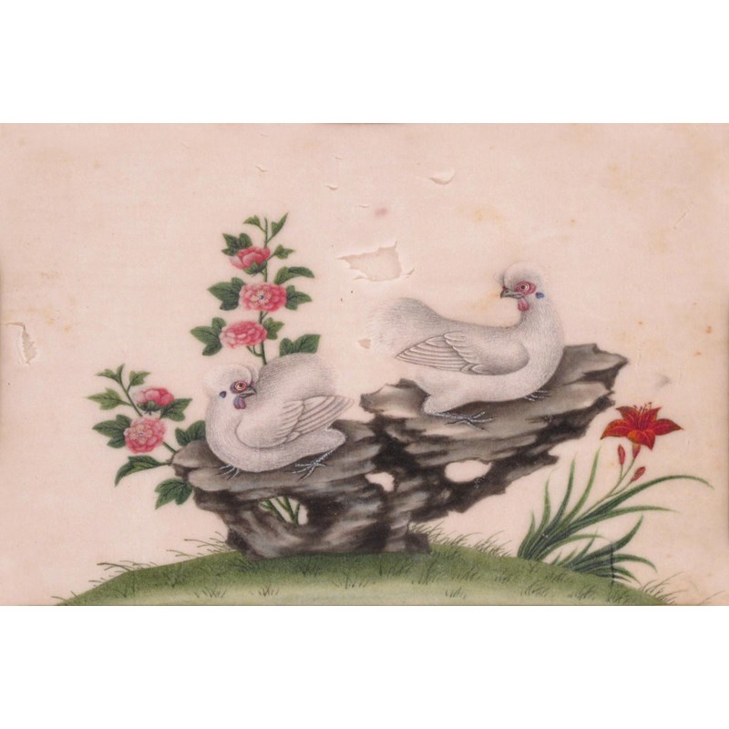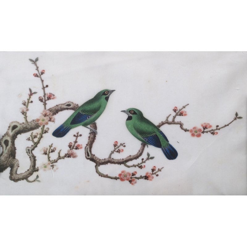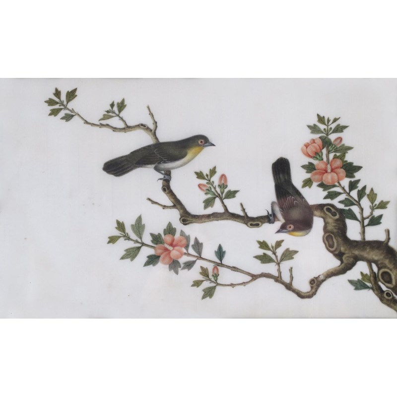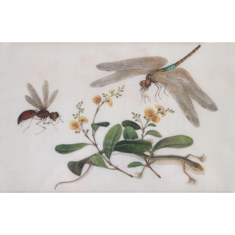 Five Chinese pith paper paintings 19th century, three depicting birds, one with fish, the other with insects and a lizard, all framed and glazed, some damages, 24cm max. (5)