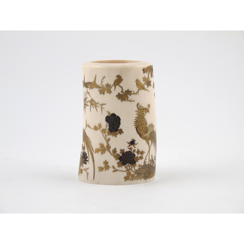 A Japanese Shibayama tusk vase c.1900, decorated with pheasants, flowers and other birds, the base plate lacking, 16cm.